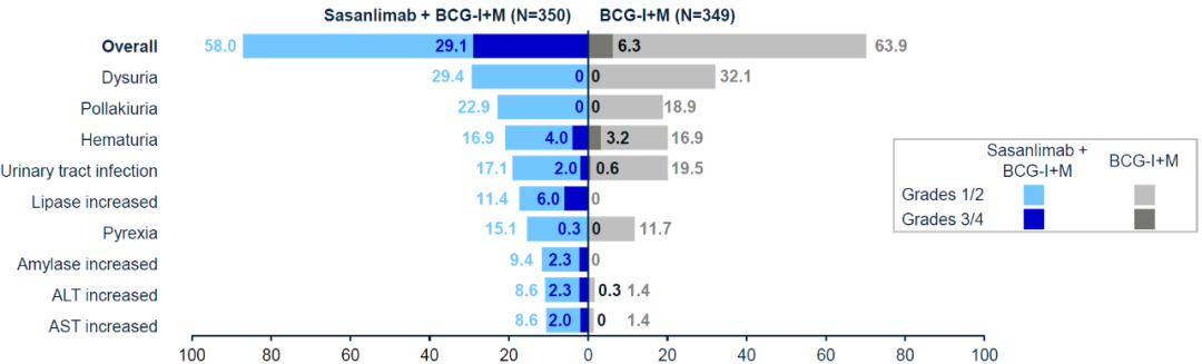 最后,在安全性方面,Sasanlimab联合BCG诱导+维持治疗安全性良好,没有出现新的安全性信号,且对比单用BCG诱导+维持治疗不会显著提升患者的不良反应发生率。总体AE发生率为58.0%vs 63.9%,3级以上AE发生率为29.1%vs 6.3%,其中最常见的不良反应为甲状腺功能异常、皮疹、肝炎、胰腺炎等。
