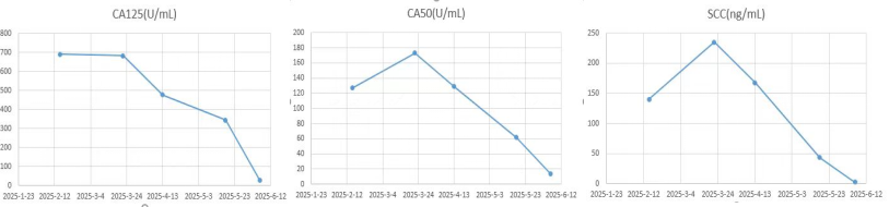 患者经上述治疗两周期后腹部及骨痛症状完全缓解,能独立行走,治疗过程中出现脱发,II度骨髓抑制,未出现其他明显的治疗相关不良反应。2025年07月PET-CT复查评估提示较前显著好转(图2),肿瘤指标降至接近正常水平(图3),总体评价PR,PFS超过6月。