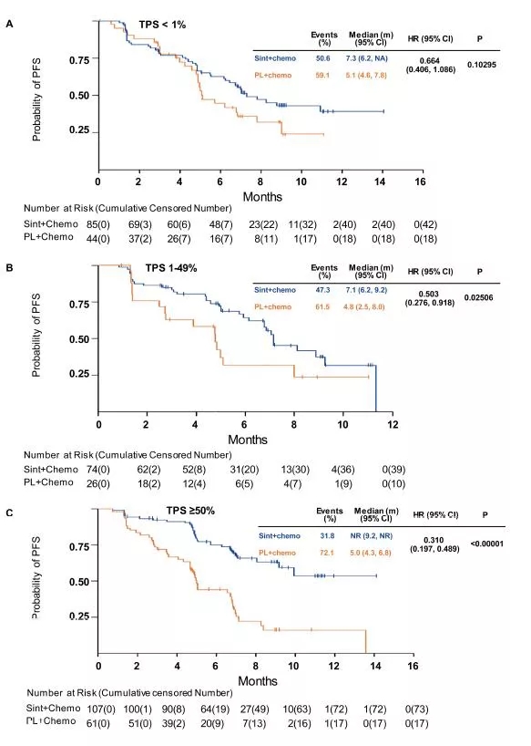 不同PD-L1表达水平的患者,均可以从这一治疗中获益。PD-L1表达<1%的患者,中位PFS分别为7.3个月和5.1个月(HR=0.664);PD-L1表达水平在1%~49%的患者,中位PFS分别为7.1个月和4.8个月(HR=0.503);PD-L1表达水平≥50%的患者,中位PFS分别为未达到和5.0个月(HR=0.310)(图3)。