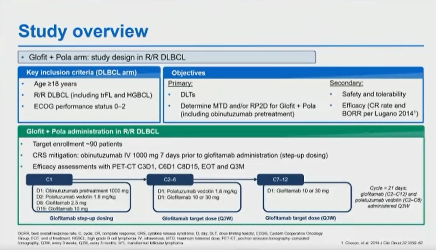 首先介绍的是一项采用双抗(Glofitamab)联合CD79b的ADC药物Polatuzumab Vedotin(Pola)针对复发/难治弥漫大B细胞淋巴瘤的Ⅰb/Ⅱ期临床研究(大会摘要号:525)。Glofitamab是非常重要的抗-CD3和抗-CD20的双抗药物,在之前的Ⅰ期研究已经显示出它对复发难治B细胞淋巴瘤具有一定的挽救治疗价值。同时,联合的药物Pola本身是一种针对CD79b的ADC药物,该项研究主要就是为了验证这两个药物联合的疗效及安全性。