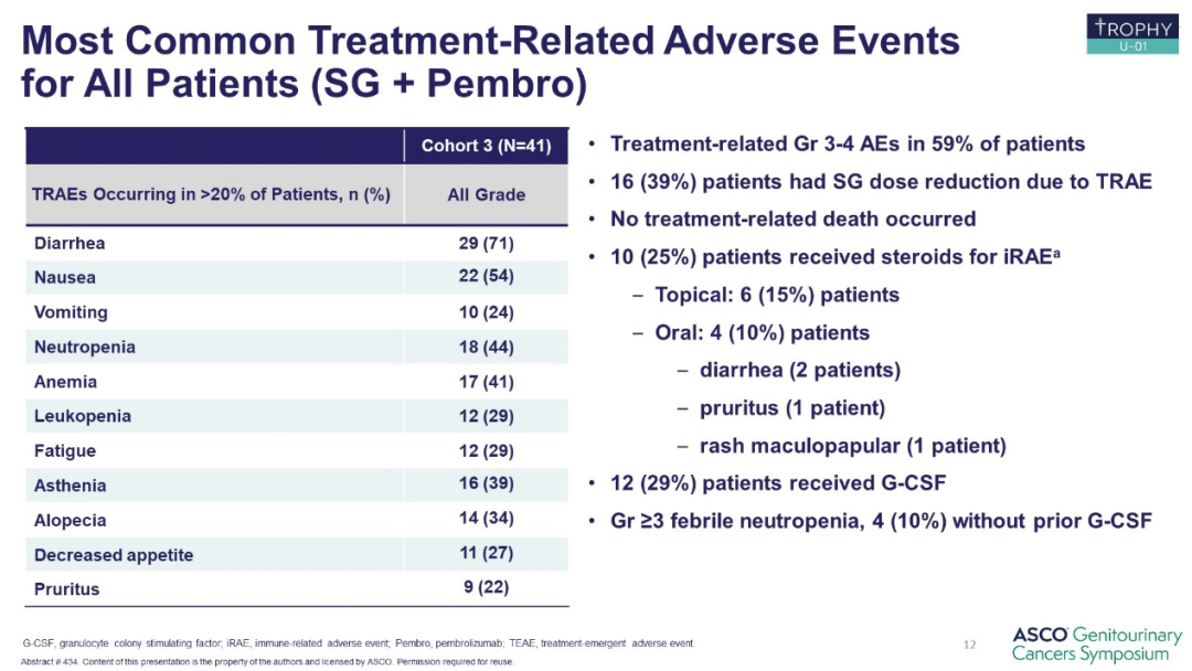 安全性方面,在TROPHY-U-01队列1中,SG的常见≥3级治疗相关不良事件(TRAE)为中性粒细胞减少症(35%)等,停药率为6%;而其他不良事件,如皮疹、间质性肺病、眼毒性、外周神经毒性等,在SG治疗中则非常少见。此次队列3报道中,最常见的治疗相关不良事件(TRAE)数据表明,SG联合CPI,免疫相关AE可控,未出现新的安全信号。与既往报道的SG和Pembro单药数据相比,SG+CPI方案也并未增加免疫相关不良反应。值得注意的是,研究并未观察到间质性肺病的发生,这对临床管理及患者生活质量的维持都极为重要。