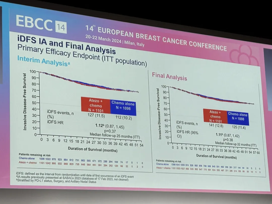 EBCC-14丨IMpassion030研究最终分析数据显示,手术后辅助化疗中加入阿替利珠单抗并不能提高TNBC患者的生存率